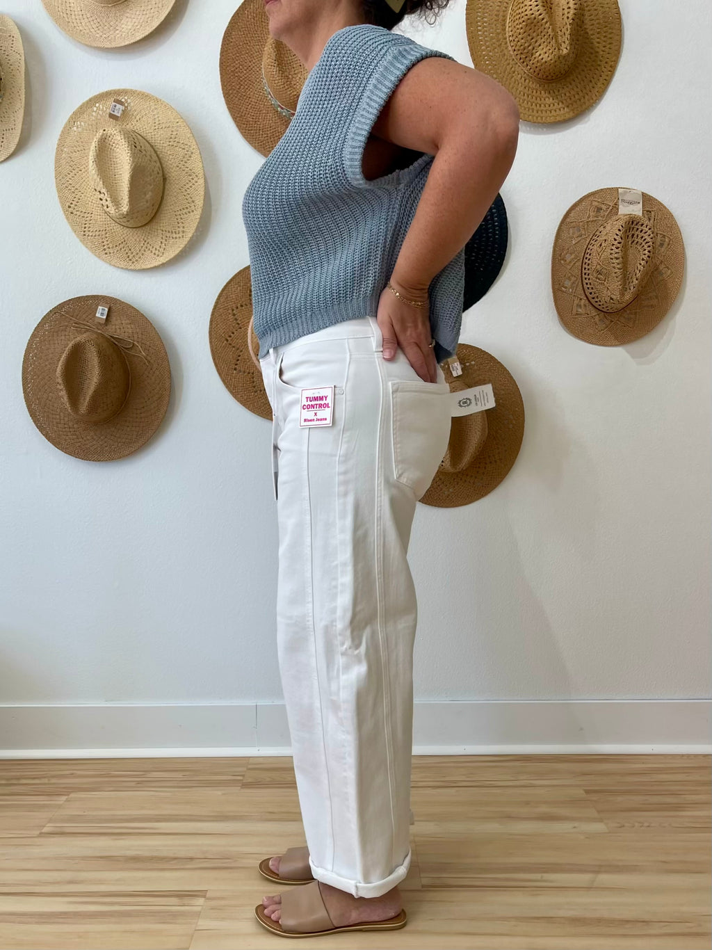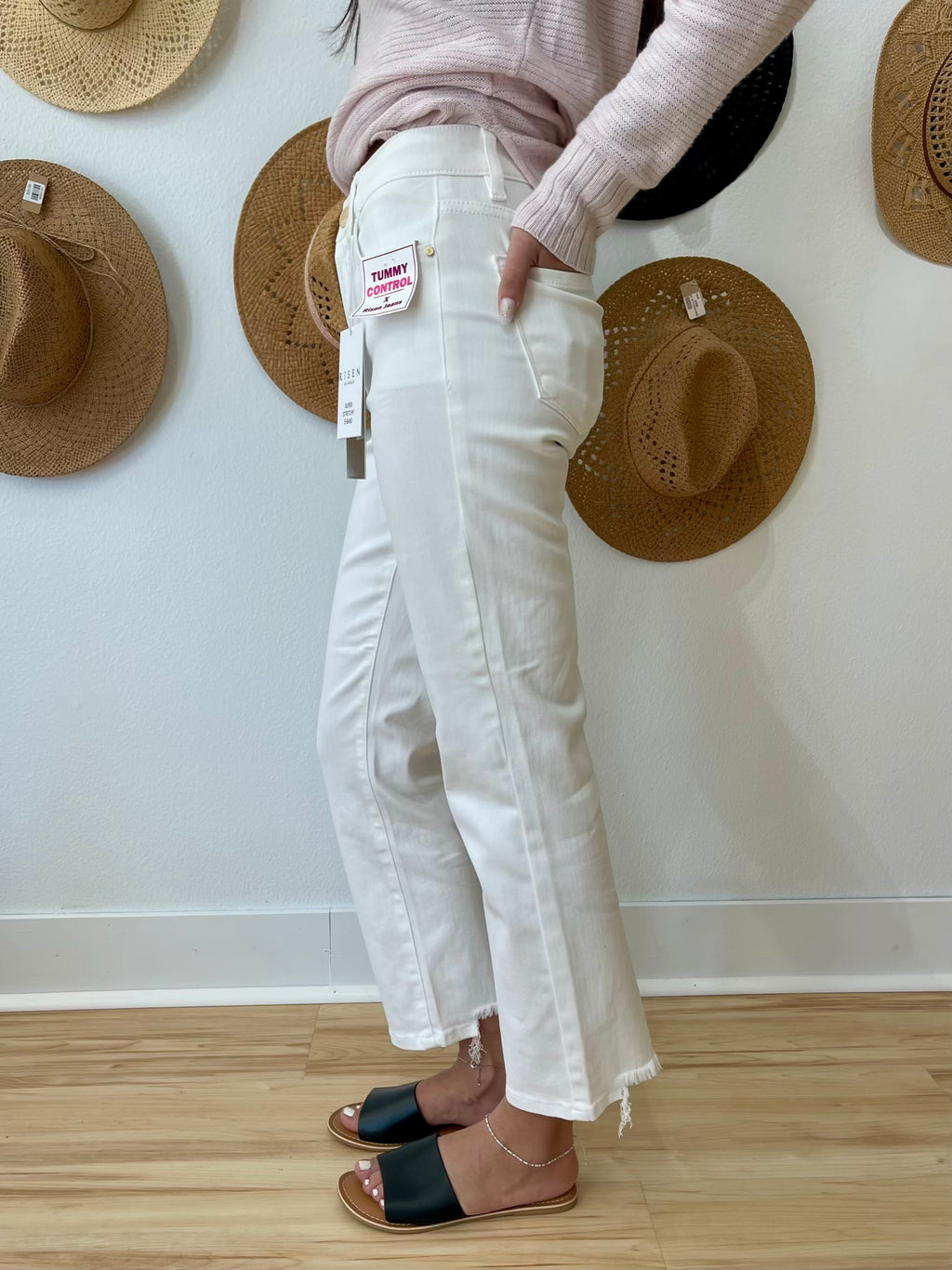 Risen Tummy Control High Rise Crop Tab Front Jeans - Light