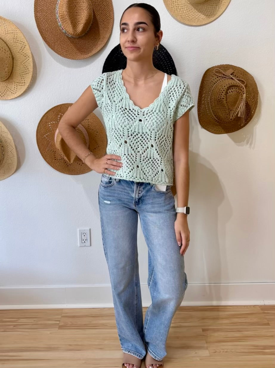 Kendra S/S Crochet Sweater - Light Mint