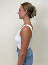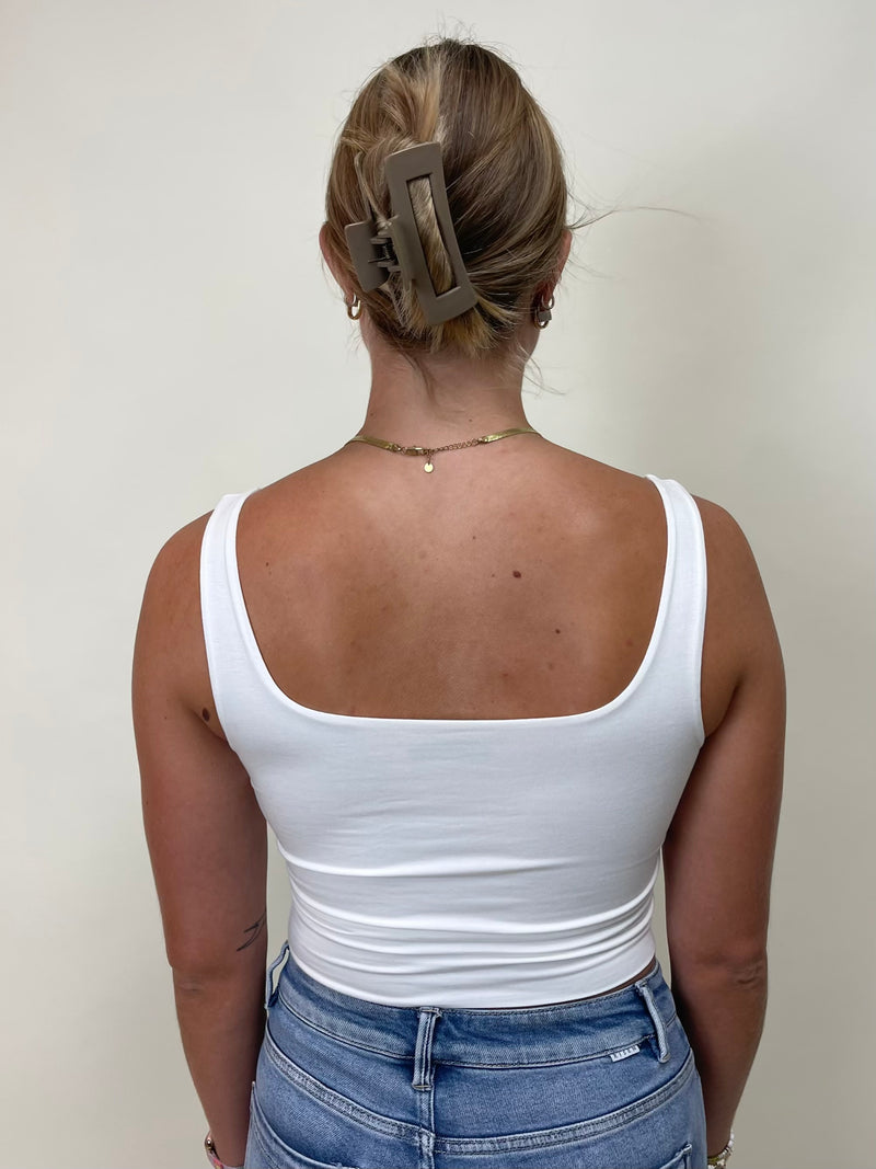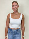 Rayon modal jersey knit fitted crop tank with a square neckline.