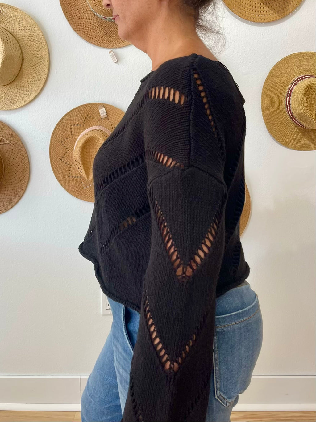 Cropped Open Stitch Detail Pullover Sweater - Washed Black